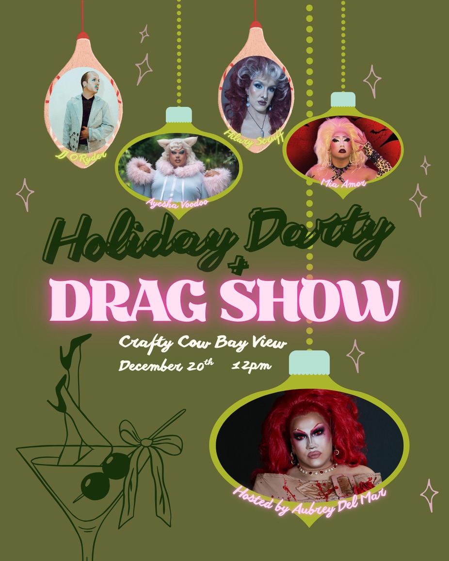 Crafty Cow Bayview is decking the halls for the queens and the day-drinkers! 🎄💋 Join us for a totally FREE Holiday Day Party + Drag Show packed with over-the-top performances, specialty cocktails, and food so good it deserves its own standing ovation. Throw on your most outrageous holiday lewk - from ugly sweaters to tinsel to a full Mrs. Claus fantasy - and come ready to sleigh the day. Hosted by Audrey Del Mar, featuring Jj ORyder, Mia Amor, Ayesha Voodoo & Hilary Scruff!